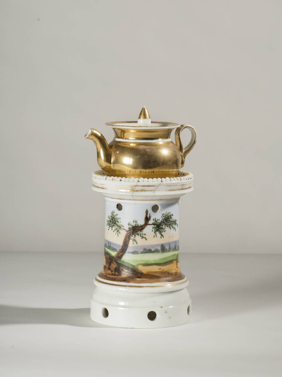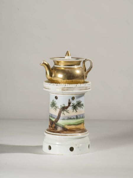 Veilleuse in porcellana dipinta a mano con raffigurazione sul fusto di un paesaggio campestre con case rurali e vegetazione. La teiera è dorata, pr\nofilature in oro per gli orli del fusto. Composta da quattro parti: base ad anello rastremata verso l'alto con fori per areazione; fusto a sezione circolare rastremato verso l'alto con fori per areazione, orlo superiore espanso rifinito con motivo decorativo a piccole sfere; teiera di forma panciuta con invaso, orlo superiore espanso, manico ad orecchio, beccuccio mosso ; coperchio dalla forma piatta con presa a punta.