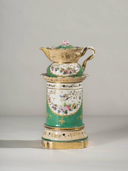 La veilleuse si compone di quattro elementi: base ad anello bombata e forata; alto fusto cilindrico con orlo superiore smerlato, fori circolari per l'areazione; teiera rastremata verso il centro, manico a nastri intrecciati e beccuccio mosso, coperchio con presa a fiore rosa. La decorazione pittorica dipinta a mano su fondo bianco, verde e beige consta di mazzi di rose policromi e pettirossi in volo. Gli orli sono dorati come pure i motivi decorativi vegetali stilizzati dipinti su tutta la superficie.
