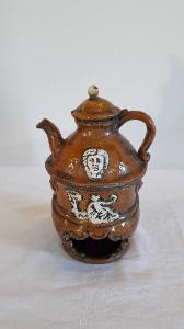 La veilleuse si compone di tre elementi: fusto a sezione circolare, apertura inferiore per il godet, orlo superiore leggermente espanso; teiera panciuta con manico ad orecchio, beccuccio mosso; coperchio con presa sferica. Dipinta in color ruggine, presenta raffigurazioni in rilievo dipinte in bianco. Di produzione novecentesca, comprata a Firenze da Manetti e Masini su imitazione di quelle toscane antiche.