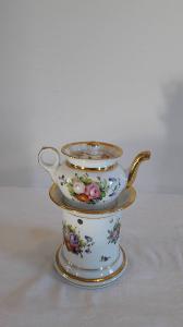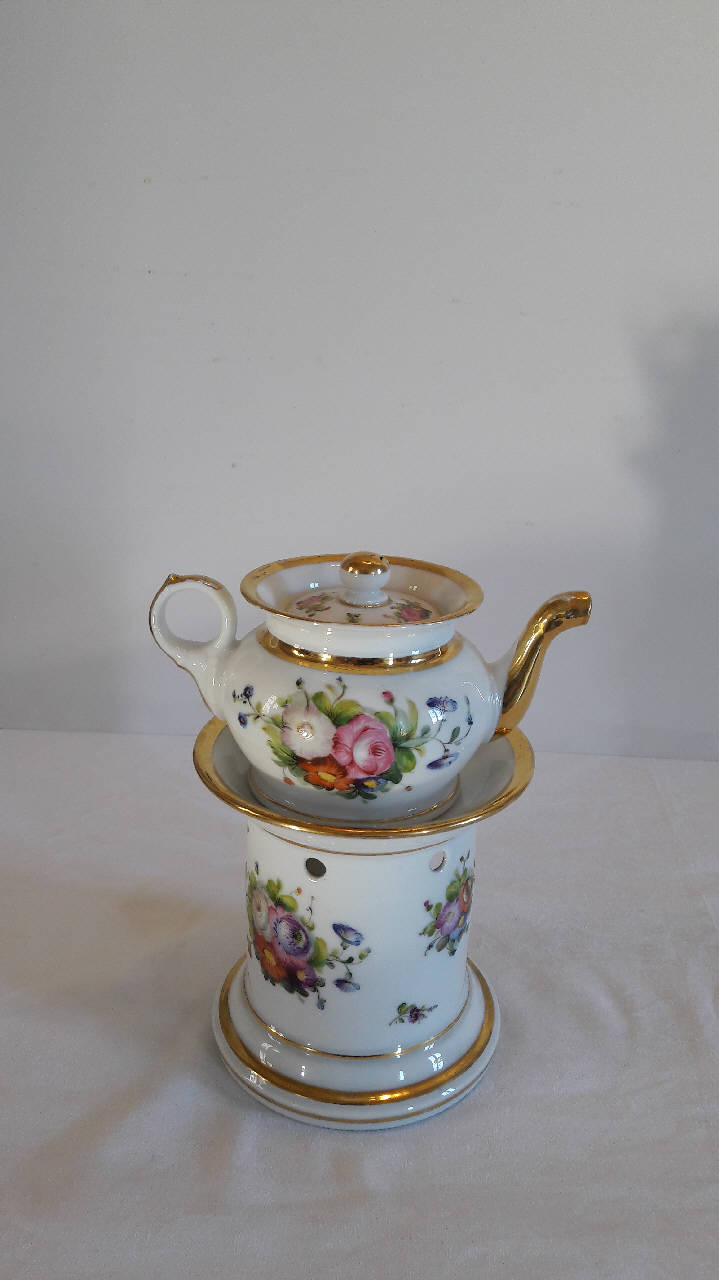 Veilleuse in porcellana dipinta a mano con decorazione, su fondo bianco, data da fiori multicolore raggruppati in mazzi, singoli o a ghirlande. Profilature in oro per gli orli e le singole componenti. Si compone di quattro elementi: fusto con base circolare rastremata verso l'alto, orlo superiore espanso, apertura inferiore per il godet che si trova all'interno del fusto; teiera dalla forma panciuta con manico ad anello con piccolo bitorzolo, beccuccio mosso, coperchio piatto con presa sferica. Di fattura novecentesca che riprende modelli dell'800.