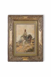 Il dipinto, a olio su tela, raffigura un soldato accompagnato da due cavalli. Opera di Giovanni Fattori (1825-1908), è di formato rettangolare orie\nntato in verticale e dotato di una cornice in legno intagliato e dorato.