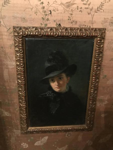 - NOTIZIE STORICO CRITICHE Il piccolo ritratto raffigura una giovane donna a mezzo busto con un abito scuro, dal cui colletto fuoriesce il profilo di una camicia bianca. Intorno al collo è avvolta una sciarpa, annodata e decorata da elementi floral\ni. La donna porta un grande cappello nero, impreziosito da un fiocco. Lo sfondo neutro e di colore grigio scuro contribuisce a dare risalto al volto della giovane, luminoso e leggermente arrossato. L¿opera è avvicinabil\ne, per lo stile, i colori e la moda, al linguaggio di Cesare Tallone, certamente noto all¿autore del dipinto. Mancano tuttavia la vivacità e la c\narica espressiva che contraddistinguono i ritratti del savonese, fortemente influenzati dalle novità introdotte a metà Ottocento dalla fotografia.\n Pittore di ritratti sin dai suoi esordi, Cesare Tallone era nato a Savona nel 1853; notato ad Alessandria da alcuni imprenditori, che si incaricarono di pagargli la retta per studiare all¿Accademia di Brera, fu allievo \ndi Giuseppe Bertini e collega di grandi innovatori della pittura lombarda a cavallo tra Otto e Novecento, tra cui Gaetano Previati, Emilio Gola, Leonardo Bazzaro, Giovanni Segantini e Angelo Morbelli. Insegnò all¿Accade\nmia di Brera per quattordici anni ed ebbe, tra i suoi allievi più illustr\ni, Giuseppe Pellizza da Volpedo. Nel 1899 vinse il concorso per la cattedra di pittura a Brera, dove rimase fino alla morte, avvenuta nel 1919.