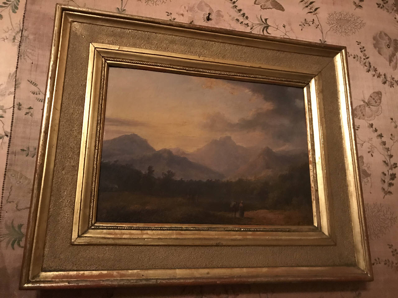 Il dipinto, a olio su cartoncino, è un paesaggio con montagne e figure al\n tramonto, attribuito a Pietro Ronzoni. Di formato rettangolare, è orient\nato in orizzontale e dotato di una cornice lignea dorata.