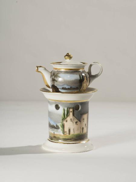 Veilleuse a fondo bianco in porcellana dipinta a mano con decorazione sul fusto e sul corpo della teiera data da scorci di paesaggi; profilature dorate lungo gli orli, il beccuccio e il manico; pomolo dorato per il coperchio della teiera. Composta da quattro parti: fusto a sezione circolare con base ad anello, apertura inferiore per il godet, grandi fori circolari per areazione nella parte superiore, orlo superiore aggettante; godet posto all'interno del fusto; teiera dalla forma panciuta con invaso, orlo superiore espanso, manico ad anello, beccuccio lievemente mosso. Coperchio con presa a pomolo. Di fattura novecentesca che riprende modelli dell'800.