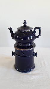 La veilleuse interamente di color blu cobalto si compone di cinque elementi: fusto a sezione circolare con due manici a pomello, ampia apertura inferiore per il godet, fori circolari per areazione nella parte superiore, orlo superiore espanso; godet circolare all'interno del fusto; elemento circolare con vaschetta per bagnomaria; teiera con invaso dalla forma panciuta, becco mosso e manico ad orecchio; coperchio con presa a punta. Profilature dorate per gli orli.