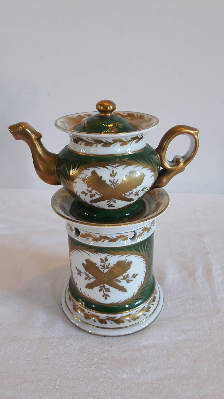 Veilleuse composta da quattro parti: fusto a sezione circolare con anello alla base, apertura per il godet, fori circolari superiori per areazione, orlo superiore espanso; godet posto all'interno del fusto; teiera dalla forma panciuta, manico ad orecchio, beccuccio mosso e pronunciato; coperchio con foro e presa sferica. Su fondo bianco e verde, la decorazione pittorica in oro della teiera è data da fiaccole intrecciate entro medaglioni ci\nrcolari, motivi decorativi vegetali stilizzati. Sul fusto, sempre in oro, raffigurazione di fiaccole intrecciate entro medaglioni circolari, motivi decorativi vegetali stilizzati, scarabeo. Profilature dorate per gli orli; il manico, il beccuccio e il pomolo del coperchio sono interamente dorati. Si tratta di un manufatto novecentesco che riprende i modelli dell'800.