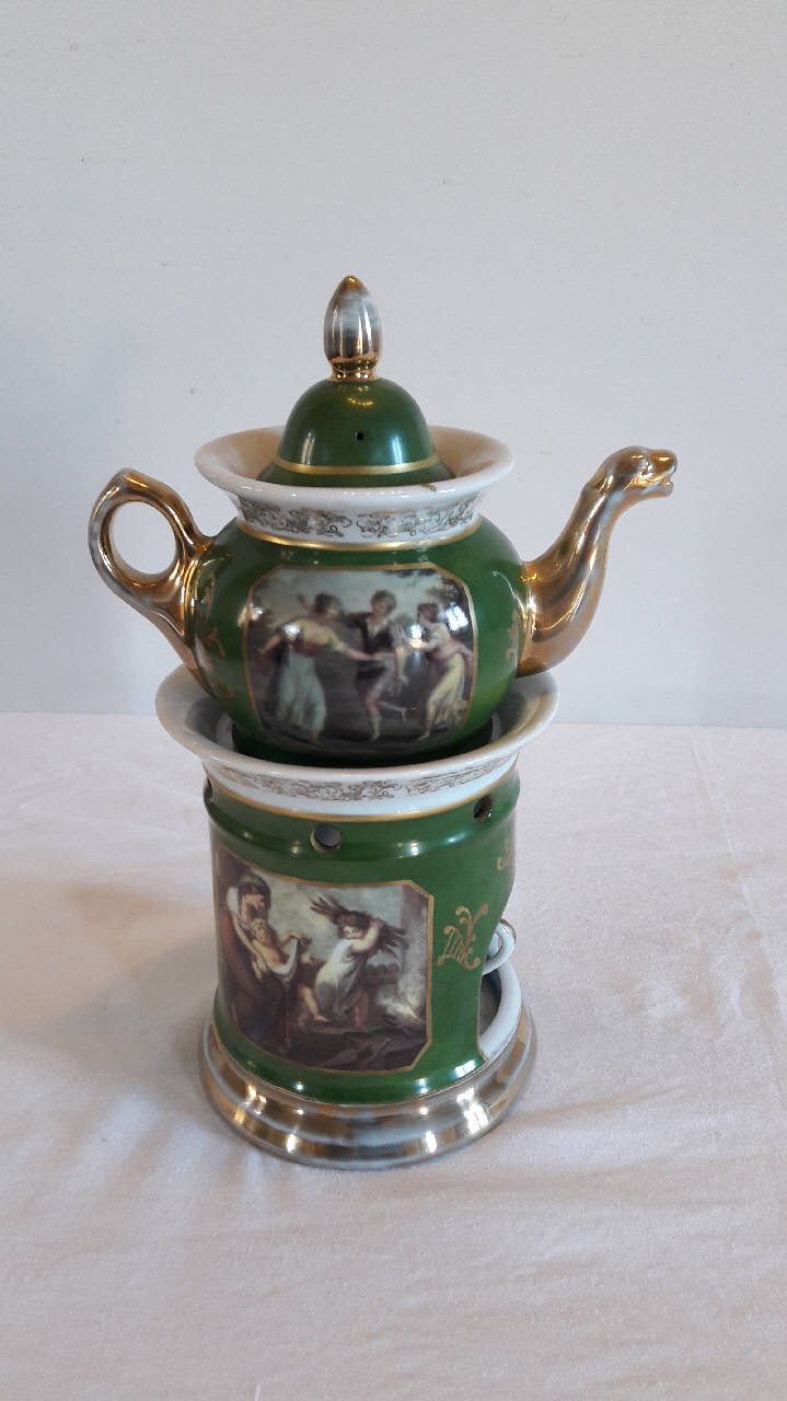 La veilleuse si compone di quattro elementi: fusto circolare lievemente svasato al fondo con apertura per il godet, fori di areazione in alto, orlo superiore sporgente; godet all'interno del fusto; teiera dalla forma panciuta, manico ad anello, beccuccio mosso e pronunciato; coperchio munito di foro e con presa a punta. Il manico, il beccuccio della teiera e la presa del coperchio sono interamente dorati; profilature dorate per gli orli. Su fondo bianco sono presenti motivi decorativi vegetali stilizzati dorati. Su fondo verde entro riquadri rettangolari dagli angoli smussati, profilati in oro, compaiono raffigurazioni galanti e dal significato simbolico.