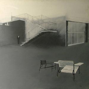 il tema dell'opera è lo spazio, qui rappresentato nella dimensione dilatata con elementi architettonici e di arredo che potrebbero definire il limite di una stanza o, all'inverso, dello spazio esterno