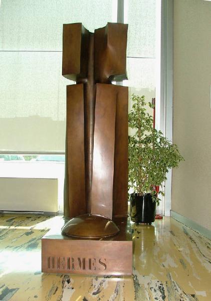 l'opera è costituita da una stele mistilinea poggiate su un piedistallo sul quale emerge una sagoma convessa. E' l'interpretazione moderna dell'iconografia storica dell'Hermes, colonna quadrangolare sulla quale è posta la testa del dio olimpico
