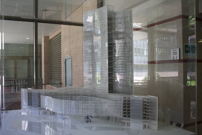 - NOTIZIE STORICO CRITICHE il progetto nasce da un concorso internazionale del 2003 con il quale la Regione Lombardia avvia il programma di progettazione della Nuova Sede, all'interno del vasto piano di riqualificazione funzionale dell'area Garibaldi-Repubblica-Varesine.\nAlla fine dell'anno sono selezionati 10 concorrenti ammessi alla seconda fase d'esame che si chiude quattro mesi dopo con l'assegnazione del primo posto al gruppo costituito dallo studio Pei-Cobb- Freed & Partners, con sede principale a New York. Il team, che si avvale poi nella fase esecutiva della partecipazione dello studio milanese Paolo Caputo Partnership e della romana Sistema Duemila, convince con un progetto dalle forme non convenzionali, almeno per la realtà milanese e, in fondo, semplice nella composizione: una torre principale e quattro fabbricati alla base, forse gli elementi maggiormente caratterizzanti per quell'andamento a sinusoide che restituiscono l'immagine di movimento, di dinamica interpretazione dello spazio. Se è dichiarato nelle intenzioni lo scopo di disegnare un "pezzo di città" per l'intera comunità, ciò è anche il presupposto dal quale partire per individuare nelle forme e nella composizione quei riferimenti continui alla regione, al suo territorio. Così viene letto l'accostarsi degli edifici che si allungano alla base del complesso, con riferimenti alle catene montuose che generano valli ed approfondimenti. Non di meno, le curve che si seguono e contrappongono sono altrettanti riferimenti ai fiumi che solcano la pianura.\nNel complesso ora in corso di costruzione della nuova sede regionale, cui si aggiungerà il nuovo grattacielo del Comune, il grattacielo di Cesar Pelli e il parco simbolicamente chiamato "Biblioteca degli alberi", la Regione concentrerà gli spazi operativi ora distribuiti in diverse parti della città. Fra le funzioni previste all'interno, oltre agli uffici della Regione sono previsti un centro congressi, sale convegni, gli spazi di biblioteca e mediateca, attività commerciali e servizi al pubblico. Ristoranti, caffè e negozi assieme a palestre e auditorium per integrare la nuova architettura della città con la quotidiana vita dei cittadini. \nSviluppato su un' area di oltre 33.000 mq compresa tra via Pola e via Melchiorre Gioia, è costituito dai quattro edifici lunghi e curvilinei sviluppati si nove piani, e dalla torre - in due corpi sfalsati che si incastrano - alta 160 metri, 33 in più del vicino Grattacielo Pirelli. \nIl plastico rappresenta gli edifici della nuova sede regionale; parte integrante del progetto vincitore, il modello è diretta conseguenza dell'assegnazione dell'incarico di progetttazione esecutiva
