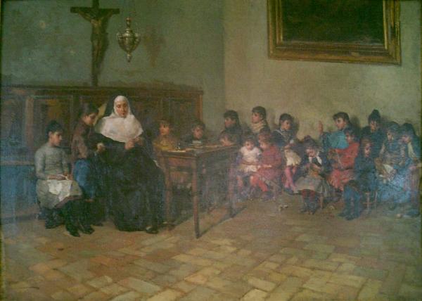 Il quadro raffigura l'interno di un'ampia stanza, di cui è ben visibile in primo piano il pavimento a piastrelle. Il centro del dipinto è occupato da una scolaresca formata da diciassette bambine di varie età che, sedute su piccoli sgabelli, imparano a cucire. Sulla sinistra la loro insegnante, una suora, siede con accando una di loro in piedi che regge il gomitolo, e davanti un tavolino su cui sono appoggiati pochi libri e un campanello. Il restante mobilio della camera è costituito da un grande mobile di legno ad ante, appoggiato sulla parete sinistra e sormontato da un crocefisso ligneo appeso al muro. La parete destra è invece occupata da un quadro con cornice dorata, di cui non è identificabile il soggetto, mentre dal soffitto pende una lampada ad olio.