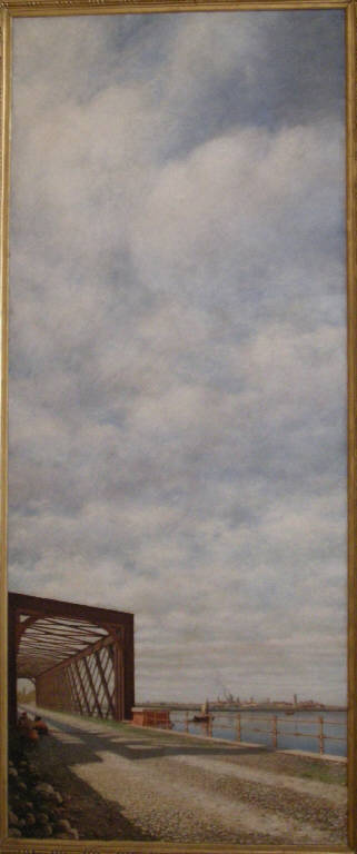 - NOTIZIE STORICO CRITICHE Il dipinto venne realizzato da Domenico Pesenti nel 1898 per l'imprenditore Luigi Valentini che lo commissionò per onorare la memoria dello zio Pietro Valentini, facendo illustrare i quattro principali lavori da lui compiuti come appaltatore di opere pubbliche: a questa tela si associano infatti anche La massiciata della ferrovia Mantova-Monselice e due opere oggi disperse, La Ferrovia Pontebbana e un soggetto non identificato. Dopo essere appartenuto alla collezione Valentini, il dipinto passò alla Raccolta Lasagna di Mantova per poi essere donato nel 1972 all'Ufficio del Genio Civile di Mantova, dove rimase insieme al suo pendant anche dopo il passaggio della sede alla Regione Lombardia.\nL'opera è rappresentativa della modernizzazione del territorio mantovano in atto nel corso del XIX secolo, a cui Pesenti dovette assistere al ritorno da un soggiorno fiorentino avvenuto tra il 1875 e il 1897: i dipinti di questa serie rappresentano infatti uno dei pochi contributi italiani nell'ambito della produzione di genere "industriale", originatasi sulla scia delle grandi trasformazioni nei territori inglesi, tedeschi e francesi degli anni '80 del XIX secolo, che portarono in pittura ad una tendenza di sentimentale apertura alla vita degli sfruttati, delle vittime dell'industria, tanto quanto ad un vivo interesse nella rappresentazione puntuale e dettagliata dei meccanismi e macchinari da loro utilizzati (Dalai Emiliani - Ginex, 1988).\nL'artista sembra qui voler imprimere nel dipinto la bellezza della nuova tecnologia in contrasto con il vecchio profilo urbano, sovrappondendo così lo sviluppo industriale moderno al paesaggio storico, il tutto accentuato dal taglio fotografico angolare ribassato che conferisce al quadro una forma allungata (Sisi, 2004).