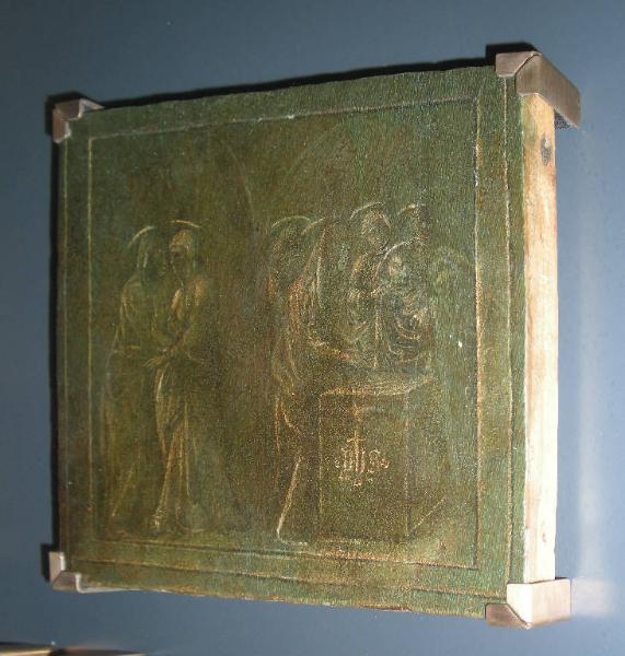 - NOTIZIE STORICO CRITICHE La tavoletta dipinta appartiene Collezione Verga, acquistata nel 2000 dalla Regione Lombardia dal collezionista Daniele Verga e poi depositata su suggerimento di Federico Zeri presso i Musei Civici di Pavia, per riunirla ad un'altra tavoletta (oggi divisa in due) raffigurante anch'essa "Storie della Vergine e di Cristo" e attribuibile allo stesso autore, un anonimo maestro lombardo della metà del XV secolo. Le sette tavolette nel loro insieme, erano probabilmente unite a formare gli scomparti di un dossale o di un altarolo portatile, come si evince dalla presenza di tagli e tracce di cerniere distribuite lungo i margini; inoltre la similarità con l'opera della Pinacoteca Malaspina ha fatto ipotizzare una loro collocazione con la funzione specifica di sportello e la conseguente doppia visione sia dal recto che dal verso (la tavoletta di Pavia è infatti dipinta a colori da un lato e a monocromo dall'altro) (Ottolenghi, 2000).\nL'ambito storico-artistico di appartenenza è quello di un maestro lombardo della metà del Quattrocento, ricollegabile alle opere tarde di Michelino da Besozzo, ma ormai aggiornato alla produzione tardogotica più moderna della bottega cremonese di Bonifacio Bembo, presente anche a Pavia (Tesori salvati, 2000): egli dipinge a monocromo, facendo emergere le sottili figure dal fondo scuro color malachite con sapienti pennellate più o meno cariche di biacca, il cui ductus si alterna a tratti parallelo e a tratti più libero e sciolto, secondo le modalità documentate nella produzione su tavola, affresco e miniature sviluppatasi nell'area settentrionale fra il II° e il III° quarto del XV secolo (Ottolenghi, 2000).