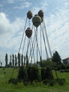 - NOTIZIE STORICO CRITICHE L'opera, realizzata dallo scultore Franz Stähler nel 1998, è stata da lui donata alla collezione di scultura contemporanea della Fondazione Pietro Rossini. Il contatto tra l'artista e Alberto Rossini avvenne in maniera casuale, verso la metà degli anni Ottanta, in seguito ad una serie di viaggi di lavoro effettuati in Germania dall'imprenditore brianzolo. Durante uno di essi Rossini conobbe il padre dello scultore, all'epoca molto giovane e non ancora affermato. Incuriosito dai suoi lavori, Rossini rimase in contatto con lui e quando l'artista si trasferì a Faenza nel 1986, lo invitò per lunghi periodi a casa sua, mettendogli a disposizione tutto l'occorrente per lavorare. Tutte le opere di Stähler presenti nel Parco di sculture della Fondazione sono dunque site-specific, ovvero create appositamente per questa sede e scrupolosamente collocate in essa dall'artista, dopo un attento studio dei parametri ambientali circostanti.\nLa ricerca artistica di Stähler parte dal materiale scelto per la realizzazione delle sue opere, essenzialmente di natura povera e profondamente legato alla terra. Il ferro, il legno, la ceramica e il mattone, vengono modellati direttamente dall'artista che li eleva a materie prime dell'arte, in un mondo dominato da eccessi e rifiuti. Anche le forme a cui si ispira richiamano alle strutture prodotte dall'uomo nel passato e dunque alla purezza della loro funzione primaria. Nell'installazione delle "Anfore", i vasi giganti di terracotta, nell'antichità utilizzati per conservare provviste, vengono trasformati in simboli dell'abbondanza e della fertilità, e dunque innalzati per mezzo di altissimi trespoli d'acciaio, quasi a volersi offrire direttamente al Cielo. Il vaso rappresenta la storia umana, il bisogno di trovare un compromesso con la vita naturale conservando i semi, l'olio, il vino. Viceversa l'altezza conduce ad un più ampio sguardo sul mondo, ad una tensione verso le grandezze del cosmo. Questi vasi di Franz Stähler costituiscono, dunque, l'occasione di riflettere sulla condizione umana poichè, al pari dell'uomo, essi nascono dalla terra e puntano alti verso il cielo.\nSeppure svettante rispetto alle altre sculture esposte nel Parco, l'opera si inserisce perfettamente nell'ambiente naturale che la circonda, inserendosi all'interno di un bacino artistico che mosse i suoi primi passi negli anni Sessanta e Settanta con la Land Art. Attorno alle sottili gambe in acciaio che sostengono i vasi, infatti, la vegetazione cresce e vi si arrampica, mentre a terra, sotto la loro ombra, gli animali della Fondazione pascolano liberamente.
