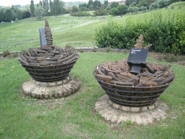 Scultura astratta composta da due cesti in acciaio intrecciato, poggianti su una base in pietra e contenenti mattoni di forma irregolare disposti a raggiera. Nella parte centrale i pezzi di cotto, dimensionalmente inferiori, vengono impilati uno sull'altro così da costruire una piccola piramide.
