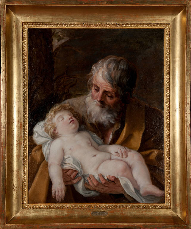 - NOTIZIE STORICO CRITICHE Il dipinto, entrato nelle collezioni civiche monzesi nel 1923 con il lascito Eva Galbesi Segrè alla città, venne esposto presso la Pinacoteca Civica in Villa Reale dalla sua apertura nel 1935 fino alla chiusura del museo negli anni Ottanta, con la sottolineatura della qualità del disegno e del colorito e l'attribuzione a Guido Reni (Arpini, 1935). A distanza di decenni la critica rivide l'attribuzione, spostandola ad alcuni seguaci del maestro bolognese: prima venne fatto il nome della pittrice e acquafortista Elisabetta Sirani (1638-1665), specializzata in soggetti di carattere devozionale (Caramel, 1981), come indicato nella targhetta metallica presente sulla cornice, poi vennero ipotizzati (Moro, 1994) i nomi di Giovanni Andrea Sirani (1610-1670), padre di Elisabetta e primo assistente del Reni, e quello di Simone Cantarini detto il Pesarese (1612-1648), noto per aver eseguito nel 1645 una pala d'altare con "San Giuseppe col Bambin Gesù" per la cattedrale di Cervia.\nLa qualità del dipinto è notevole e indubbia è del resto la dipendenza da modelli reniani: il tema del putto addormentato era stato affrontato dal maestro bolognese sin dagli anni Venti del Seicento come dimostra il celebre dipinto oggi conservato al Museo di Arte Antica di Palazzo Barberini e datato 1627, mentre la figura di San Giuseppe che regge il Figlio è stata da lui elaborata nell'opera conservata al Museum of Fine Arts di Houston, databile al 1638-40, in un dipinto esposto presso il Museo Diocesano di Milano (inv. MD 2002.109.002), proveniente dal Palazzo Arcivescovile e datato 1625-1630, e almeno in un altro dipinto di analogo soggetto conservato presso l'Hermitage di San Pietroburgo, anch'esso databile intorno al 1635. Pur sottolineando come nei prototipi noti il Bambino sia sempre sveglio, mentre nella versione monzese appaia dormiente, è verosimile pensare che il dipinto qui schedato sia opera di un autore appartenente alla cerchia del Reni che abbia cercato analogie con le opere del maestro dipinte nella tarda maturità, dopo il 1635 (Vergani, 2010). \nDal punto di vista iconografico questo era un tema assai caro nella pittura devozionale della prima metà del Seicento, in un momento storico in cui la figura di Giuseppe fu oggetto di una rivalutazione e di un processo di definizione iconografica a sé stante rispetto al soggetto tradizionale della Sacra Famiglia. L'immagine di San Giuseppe nella storia dell'arte occidentale non ha infatti radici lontane nel tempo come quella della Vergine Maria. Inizialmente, anzi, il padre putativo di Gesù era una figura marginale, spesso assente, di cui i Vangeli sinottici dicono poco, e che dunque veniva ritratto vecchio, calvo, secondo le descrizioni di lui fatte nei Vangeli apocrifi, in modo da allontanare qualsiasi sospetto di una sua partecipazione alla procreazione del Bambino. Da figura subalterna e muta, Giuseppe passò poi nel XVI secolo a diventare protagonista di una serie di rappresentazioni, prima in qualità di falegname al lavoro per mantenere la famiglia (sia da solo che insieme ad un giovane Gesù), poi in una relazione più intima con i componenti della sua famiglia, con compiti di guida e protezione. E' questo il caso delle numerose rappresentazioni dell'episodio della "Fuga in Egitto", in cui Giuseppe interagisce spesso con il Bambino offrendogli piccoli animali o oggetti. Ma è nel corso del Seicento che il santo cominciò ad apparire in composizioni in cui tiene tra le braccia con gesto affettuoso il piccolo Gesù, senza la presenza di Maria, assecondando la diffusione del culto sostenuta principalmente dagli ordini monastici dei Carmelitani riformati e dei Gesuiti in un contesto artistico di rinnovata attenzione alla realtà degli ambienti e degli affetti.\nIn questo caso l'immagine presenta sullo sfondo un tronco che il recente restauro effettuato nel 2012 ha permesso di valutare meglio come riferibile a una palma, facendo dunque ritenere il soggetto monzese come un momento di un "Riposo durante la fuga in Egitto", soluzione non nuova nell'ambito dei modelli reniani: sia nel già citato San Giuseppe del Museo Diocesano che in quello dell'Hermitage, infatti, sulla destra della composizione, nello sfondo dietro il manto di Giuseppe, appaiono in lontananza le figurette di Maria sull'asino e dell'angelo, riferibili al medesimo episodio sacro.