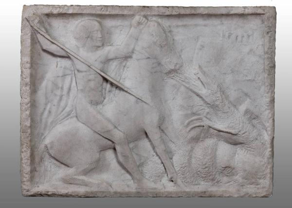 - NOTIZIE STORICO CRITICHE Secondo la testimonianza diretta dell'autore, lo scultore, pittore e incisore italiano Marino Marini, il rilievo marmoreo fu da lui eseguito tra il 1930 e il 1931, durante l'esperienza monzese dell'ISIA, l'Istituto Superiore Industrie Artistiche di Monza, dove il pezzo rimase fino alla chiusura della scuola avvenuta nel 1940, alla vigilia del conflitto mondiale: Marini aveva assunto la cattedra di Plastica in quegli stessi anni, succedendo ad Arturo Martini, ma abbandonò l'opera alla sua partenza da Monza nel 1941, dopo il bombardamento dello studio milanese che lo convinse a lasciare la città per qualche tempo rifugiandosi nel Canton Ticino. L'opera è pervenuta ai Musei Civici nel 1976 dalla Civica Scuola Serale Artigiana Paolo Borsa, anch'essa avente sede, come l'ISIA, presso alcuni ambienti del complesso monumentale della Villa Reale.\nIl bassorilievo risulta non finito e con probabili interventi degli allievi. Esso costituisce di fatto l'unico lavoro dell'artista direttamente sbozzato a scalpello sul marmo e presenta forme arcaizzanti, che interpretano temi classici con uno spirito ed una tecnica moderni: la struttura del rilievo e la forma del pezzo paiono infatti citare la forma antica della metopa, vivacizzata dall'andamento diagonale della lancia di San Giorgio che imprime dinamismo alla composizione. \nL'opera costituisce inoltre il primo esempio della fondamentale tematica del "cavallo e cavaliere", poi ampiamente praticata dallo scultore: per l'artista infatti l'immagine dell'uomo a cavallo era vista come un vero e proprio simbolo in grado di racchiudere tutta la storia dell'umanità e della natura, nonchè il proprio modo personale di dare forma alle passioni dell'uomo. Il gruppo equeste, che con il passare degli anni divenne nella produzione di Marini sempre più espressionista, disconnesso e frammentato nella sua realizzazione, fu il suo soggetto prediletto per esprimere tutta la sua ansia per la condizione umana e per il fragile rapporto tra uomo e natura. In questa specifica opera l'artista priva San Giorgio della sua armatura e il cavallo dei finimenti, facendo diventare il rapporto tra il santo e l'animale quasi simbiotico, come a voler fondere in uno i loro due corpi per giungere alla rappresentazione di un mitico centauro. Le spropositate dimensioni dell'uomo rispetto al corpo dell'animale inoltre, contribuiscono qui a far mantenere al gruppo un saldo equilibrio di fronte all'avanzata del drago, cosa che invece non manterrà nelle rappresentazioni successive del soggetto, soprattutto durante gli anni drammatici della Seconda Guerra Mondiale, quando il cavaliere verrà invece raffigurato sempre più stremato e meno eroico e il cavallo sempre più incontrollabile.