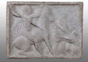 Rilievo scolpito su una lastra di marmo bianco, di forma rettangolare con orientamento orizzontale.