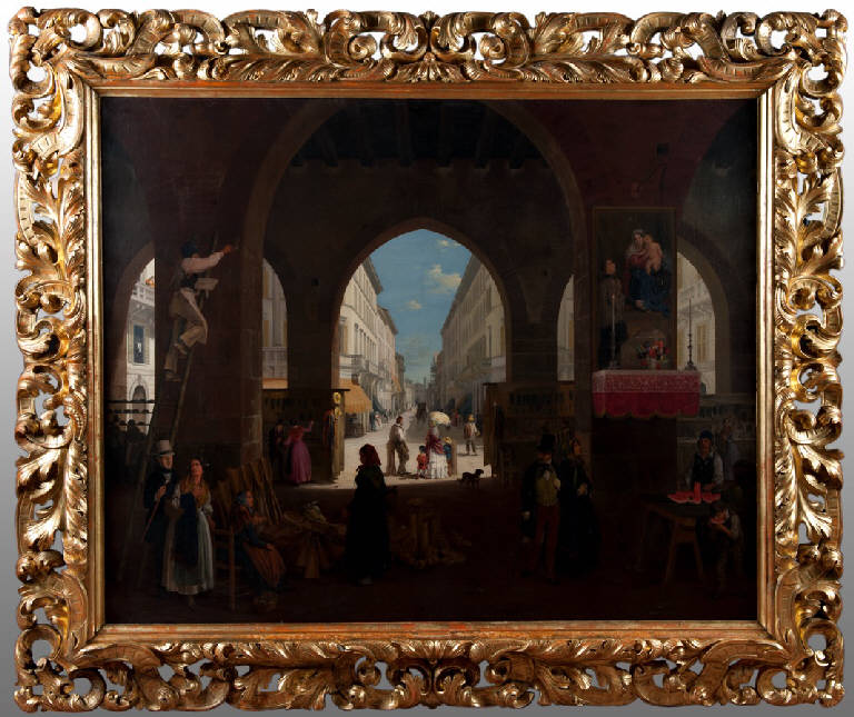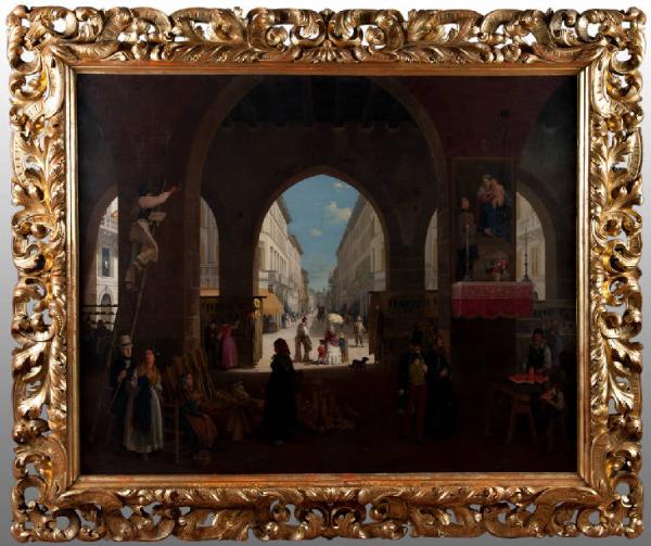 - NOTIZIE STORICO CRITICHE La veduta fu commissionata ad Angelo Inganni dal dottor Giovanni Masciaga e venne esposta a Brera nel 1850. L'opera fu riprodotta in un'incisione dallo svizzero Louis Cherbuin (1810-1875) e pubblicata nel catalogo dell'evento. Esposto alla Galleria Scopinich di Milano in occasione di un'asta nel 1934, il dipinto fu segnalato al Comune di Monza da Rino Bianchi, figlio del pittore Gerardo e nipote di Mosè, che ne curò poi l'acquisto a vantaggio delle civiche raccolte d'arte, all'epoca in fase di costituzione. Giudicata di altissimo livello qualitativo, in attesa della collocazione definitiva presso le sale della Pinacoteca Civica di Villa Reale, l'opera fu esposta in un angolo del Salone dei ricevimenti del Palazzo Civico (M.R. 1934). Della tela è oggi noto anche un bozzetto di piccole dimensioni (15x20 cm), recentemente passato sul mercato antiquario (Farsettiarte, 2012).\nLa grande tela raffigura una veduta della Strada Ferdinandea, così denominata in occasione della visita a Monza di Ferdinando I d'Asburgo (ribattezzata poi Via Vittorio Emanuele in onore del primo re d'Italia), realizzata nel 1842 operando un taglio netto nel più antico tessuto edilizio cittadino. Tale intervento si era reso necessario per conferire un aspetto decoroso alla nuova strada militare per il passo dello Spluga e l'Austria che, iniziando proprio dall'Arengario, ribadiva il legame tra la capitale dell'Impero e la sede della villa arciducale, nonchè luogo dov'era conservata la Corona Ferrea, già simbolo del Regno d'Italia e poi del Lombardo-Veneto. La strada, vista da sotto i portici dell'Arengario, appare nel dipinto affiancata da una cortina di sobri edifici ottocenteschi, alcuni dei quali ancora in costruzione. Oltrepassato il Ponte dei Leoni (anch'esso elemento architettonico ottocentesco edificato in sostituzione del ponte romano di Arena) è chiusa prospetticamente sul fondo dalla facciata della chiesa di S. Maurizio, un antico edificio religioso rimaneggiato in epoca gotica e abbattuto nel 1884 per consentire l'ampliamento della carreggiata del nuovo asse viario.\nInganni immortala qui con cura documentaria e minuzia di particolari l'animata vita cittadina in una serie di "quadretti" tratti dalla realtà quotidiana, descritti con quel tono elegante e misurato che fece dell'artista uno dei più apprezzati autori di vedute urbane nella Lombardia di metà Ottocento, in linea con quanto riscoperto dalla metà del secolo anche da artisti quali Giuseppe Molteni e i fratelli Induno. Inganni oppone qui alla piena luce della via, nella quale si muovono e sostano figure e vetture (in una sorta di quadro all'interno del quadro), lo spazio ombroso e accogliente del portico in primo piano, dove si collocano banchi del mercato e commercianti di fettucce e cappelli, attrezzi di legno e cocomeri, ma anche un muratore intento nel restauro della parete e un altare pensile con un'immagine sacra addossato ad uno dei pilastri. A documentare il lavoro di studio e ricerca preliminare compiuto dall'autore su queste scene tratte dal vero, rimangono alcuni schizzi dell'Arengario e di figure di borghesi e popolane destinate ad animare la veduta cittadina, spesso utilizzati dal pittore anche in alcune composizioni milanesi.