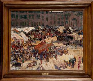 - NOTIZIE STORICO CRITICHE L'opera, datata 1911, fu acquistata dal Comune di Monza nel 1915 a conclusione della mostra a favore dei disoccupata organizzata presso l'Arengario dall'autore, Anselmo Bucci, e dall'amico Eugenio Baioni, insieme ad uno dei suoi quadri parigini raffigurante Pont Saint Michel, e ad un bronzetto di Baioni noto come "Il Disoccupato". \nIl dipinto costituisce uno dei pezzi di maggior interesse nella produzione giovanile dell'artista marchigiano, reduce dall'esperienza parigina e ancor più interessante in quanto confrontabile con due dipinti di analogo soggetto pressoché contemporanei, realizzati dai due artisti che insieme a lui si raggrupparono nel primo decennio del Novecento scegliendo l'altisonante denominazione "Coenobium": si tratta delle opere di Eugenio Baioni (1910, inv. DEF 0290) e di Guido Caprotti (1910, inv. DEF 0273). Entrambe di proprietà comunale e attualmente esposte presso i Musei Civici di Monza Casa degli Umiliati, di fianco all'opera qui schedata, queste tele attestano l'intersse dei tre artisti per le stesse tematiche che furono tuttavia affrontate con personale afflato poetico e capacità tecniche differenti.\nLa tela raffigura la grande piazza del mercato di Monza nella quale si svolgeva in passato la fiera estiva di S. Giovanni, evento dalle lontane origine storiche che per secoli ha accompagnato la vita cittadina monzese. A differenza di Caprotti e Baioni, Bucci decide di concentrare l'attenzione su una parte limitata di questo immenso luogo, in cui può mostrare le plastiche forme dei bovini in vendita da un punto di vista insolitamente alto. L'artista sceglie di escludere dalla composizione il cielo e dispone gli edifici attorno alla piazza come una quinta teatrale chiusa, caratterizzata da toni bruno-rossicci in netto contrasto con la luminosità dello spazio aperto in primo piano, dove invece spiccano le tende bianche dei banchi dei mercanti e le forme mosse e variegate che animano la folla, caratterizzata da una materia pittorica ricca e corposa, vibrante nei toni vermigli.