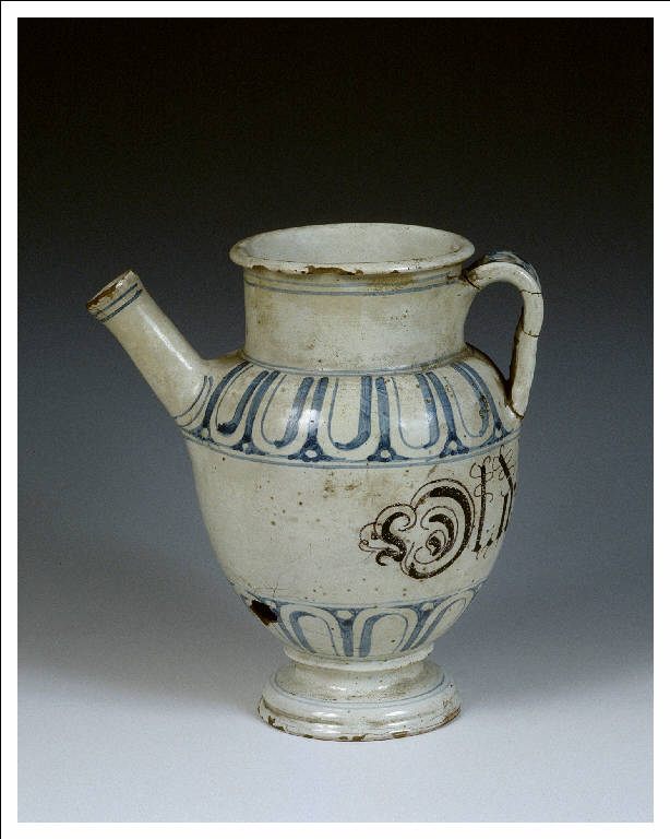 Contenitore con ansa piatta a nastro, decorata; il corpo dalla forma ovoidale e slanciata ha collo alto e largo, con orlo rinforzato e beccuccio a cannone.