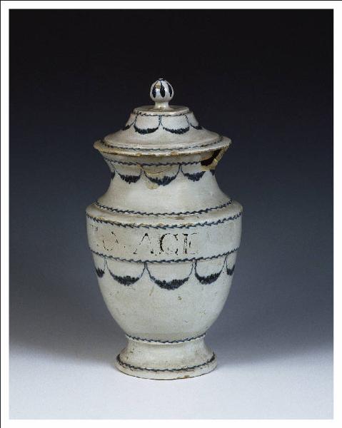 Contenitore con corpo a balaustro su alta base digradante; l'ampio collo svasato è chiuso da coperchio ad incastro con pomolo.