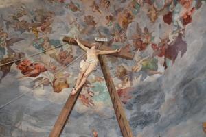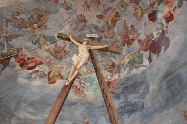- NOTIZIE STORICO CRITICHE La decima cappella, dedicata alla Crocifissione di Cristo, quinto mistero doloroso del Rosario, risulta ultimata nel 1623, ma ancora dopo il 1683 si intervenne per il risolvere un problema legato alla facciata. In origine infatti non era prevista la scalinata perpendicolare al prospetto principale, che venne realizzata per ovviare all'inconveniente dato dall'esistenza di un unico alto gradone, enza il quale non si poteva superare il dislivello tra il piano del viale e quello del pronao. Per quanto riguarda l'apparato scultoreo, solo negli anni sessanta del Seicento si procedette all'esecuzione e alla messa in opera delle cinquantadue statue, da parte di Dionigi Bussola e della sua bottega, all'interno della quale lavorava anche lo scultore Carlo Antonio Bono, autore della statua in pietra di San Carlo sull'omonimo arco, all'interno del complesso varesino. La scelta di Bussola all'interno del cantiere fu piuttosto significativa: si era infatti deciso di affidarsi a colui che dagli anni sessanta alla morte, avvenuta nel 1687, lavorò presso i Sacri Monti di Varallo, Varese, Orta e Domodossola, senza mai abbandonare il ruolo di protostatuario presso la veneranda fabbrica del duomo di Milano e presso la certosa di Pavia. Gli affreschi furono eseguiti da Antonio Busca, che li firmò, nel 1668. Un intervento di Poloni negli anni 1926-1928 interessò la ridipintura di alcune parti delle pareti. Nel 1985 è stato eseguito un accurato restauro della cappella volto al recupero, dove possibile, della decorazione pittorica originaria. Nel corso di questo intervento la cappella è stata dotata di un impianto di illuminazione attivabile dall'esterno. \nNel 2003 l'intero Sacro Monte di Varese è stato riconosciuto dall'Unesco Patrimonio Mondiale dell'Umanità, insieme ai complessi piemontesi di Belmonte, Crea, Domodossola, Ghiffa, Oropa, Orta, Varallo, e a quello lombardo di Ossuccio.