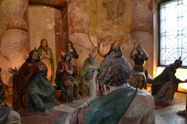 - NOTIZIE STORICO CRITICHE Nel 1623 la tredicesima cappella, dedicata alla Discesa dello Spirito Santo, risulta ultimata per quanto riguarda le opere murarie, progettate e dirette dall'architetto Giuseppe Bernascone. Non si hanno invece notizie dirette circa l'esecuzione e la messa in opera delle sculture, tradizionalmente attribuite a Francesco Silva, sulla base del rinvenimento di una targa frammentaria rinvenuta sulla schiena dell'apostolo vestito di bianco, al centro della panca di fronte alla finestra a nord. È andato perduto il particolare con la data di esecuzione. Se si escludono le statue della prima cappella raffiguranti la Madonna e l'Arcangelo Gabriele, le più piccole dell'intero Sacro Monte, quelle della tredicesima cappella risultano comunque di dimensioni inferiori rispetto a tutte le altre. Non solo, l'impasto materico non è omogeno, e in alcune parti la cottura risulta malriuscita. Le numerose discrepanze con le altre opere certe di Silva hanno indotto la critica a considerare un'ampia collaborazione della sua bottega. Tra il 1681 e il 1684 è documentato un intervento alla lanterna cieca, progettata ma non ancora realizzata a quell'epoca. Gli affreschi figurativi sono opera di Federico Bianchi da Masnago, mentre le parti di architettura dipinta sono dei fratelli Giovan Battista e Gerolamo Grandi di Varese. Sullo scudo di Davide è stata apposta la data 1647 ma è da ritenersi apocrifa.\nGli affreschi furono in parte ridipinti da Poloni nel 1922 e restaurati nel 1990, quando si provvide anche ad illuminare la cappella con un sistema azionabile dall'esterno.\nNel 2003 l'intero Sacro Monte di Varese è stato riconosciuto dall'Unesco Patrimonio Mondiale dell'Umanità, insieme ai complessi piemontesi di Belmonte, Crea, Domodossola, Ghiffa, Oropa, Orta, Varallo, e a quello lombardo di Ossuccio.