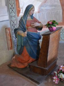 - NOTIZIE STORICO CRITICHE La prima cappella dedicata all'Annunciazione, primo dei misteri gaudiosi, è collocata in prossimità della gradinata che dal ponte sul torrente Perlana conduce, non senza qualche difficoltà, al percorso devozionale verso il Santuario della Beata Vergine del Soccorso. Un tempo l'edificio era attorniato da mulini e frantoi, come riporta una guida del lago di Como del 1877, mentre oggi è circondato da abitazioni. Il luogo, quindi, ha subito una significativa trasformazione che, tuttavia, non ha alterato completamente la scenografica sequenza delle cappelle del Sacro Monte. Malgrado numerosi studi si siano susseguiti nel tempo non sono ancora noti gli artisti che lavorarono all'apparato scultoreo. La postura e la gestualità delle due figure esprimono un fitto dialogo, che sintetizza l'annuncio da parte dell'Angelo Gabriele a Maria che, unita alla presenza al Sacro Monte di Ossuccio della famiglia ticinese dei Silva, ha indotto la critica a ritenere ascrivibili alla bottega di Francesco la Madonna e l'Angelo. Le due statue sarebbero dunque state realizzate nella prima fase edificatoria del complesso, entro gli anni trenta del Seicento. La costruzione della cappella, infatti, fu finanziata dal canonico Giovanni Bartolomeo Salice di Campo, presumibilmente entro i primi tre decenni del XVII secolo. Un'altra ipotesi attributiva è stata avanzata dalla critica basandosi su confronti stilistici, ipotizzando il coinvolgimento di Cristoforo Prestinari, abile scultore attivo in differenti Sacri Monti lombardo-piemontesi, tra i quali quelli di Varese e di Orta, che però morì nel 1623. Gli affreschi che riproducono l'interno della stanza di Maria, invece, sono stati recentemente attribuiti a Salvatore Pozzi, artista seicentesco formatosi a Milano e attivo anche presso il Santuario di Ossuccio. Riferimenti stilistici, dunque, si possono avanzare con le decorazioni pittoriche che egli eseguì in Piemonte e in Svizzera. L'edificio è stato oggetto di un accurato restauro nel 2002 e a questo sono seguite numerose significative pubblicazioni.