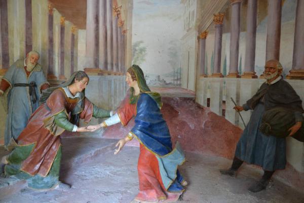 L'interno della seconda cappella del Sacro Monte di Ossuccio ospita quattro statue in terracotta a grandezza naturale, dipinte a freddo, raffiguranti Maria, Giuseppe, Elisabetta e Zaccaria. Fulcro della scena è l'incontro tra Maria ed Elisabetta, poste al centro dello spazio, nell'atto di stringersi la mano destra, immortalate in un gioioso slancio reciproco. Elisabetta sta scendendo quasi di corsa da un piano rialzato e alle sue spalle in prossimità della parete di fondo si trova Zaccaria. Maria è abbigliata come nella prima cappella, ma a differenza della scena dell'Annunciazione in cui è scalza, qui indossa dei sandali e ha i capelli sciolti sulle spalle, che fuoriescono dal pesante velo che le copre il capo. Elisabetta, donna matura dal sorriso radioso, indossa un abito tipico di inizio Seicento, con un importante collo bianco e una sopravveste dallo scollo quadrato. Alle spalle delle due donne si stagliano Zaccaria e Giuseppe, entrambi anziani, con fluenti barbe bianche. Giuseppe tiene un bastone nella mano destra e un sacco nella sinistra. Le analogie tra la figura di Elisabetta e il medesimo soggetto realizzato da Francesco Silva nella cappella della Visitazione presso il Sacro Monte di Varese, hanno indotto la critica a ritenerle opera del medesimo scultore.