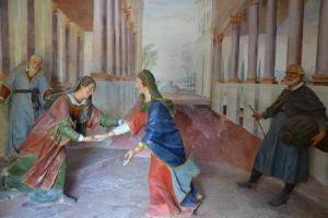 - NOTIZIE STORICO CRITICHE La seconda cappella, dedicata alla Visitazione, secondo dei misteri gaudiosi del Rosario, si raggiunge dopo aver percorso una lieve salita. Da qui si possono intravedere il santuario del Soccorso e alcune cappelle del Sacro Monte, oltre al lago e ad uno scorcio di Bellagio. Questa visione consente di osservare il consumo del territorio avvenuto nella zona che, tuttavia, ho solo in parte aggredito il Sacro Monte. Come per la cappella dell'Annunciazione sono molto scarse le notizie storiche inerenti l'esecuzione delle decorazioni interne e del relativo apparato scultoreo. Alcune fonti storiche, tuttavia, asseriscono che l'edificio fu costruito 1635 a spese del Santuario tra il 1623, periodo dopo il quale sarebbe da collocare la realizzazione degli apparati plastici interni. Le cappella della Visitazione presso il Sacro Monte di Varese, hanno indotto la critica a ritenere le sculture di Ossuccio opera del medesimo scultore. Numerose ridipinture hanno interessato tutte le statue della cappella, che hanno perso alcune delle caratteristiche determinate dalle modalità di stesura dei colori e dalla loro finitura. Gli affreschi alle pareti, anch'essi di autore ignoto, presentano uno sfondato prospettico impostato su colonne, con al centro un paesaggio lacustre e un castello turrito, che non aiutano a collocare temporalmente l'esecuzione dell'opera. Dopo un periodo in cui la cappella fu quasi abbandonata a se stessa, la struttura architettonica e gli apparati decorativi interni sono stati restaurati nel 2005, all'interno di una vasta campagna di tutela e valorizzazione del patrimonio artistico-architettonico del Sacro Monte.