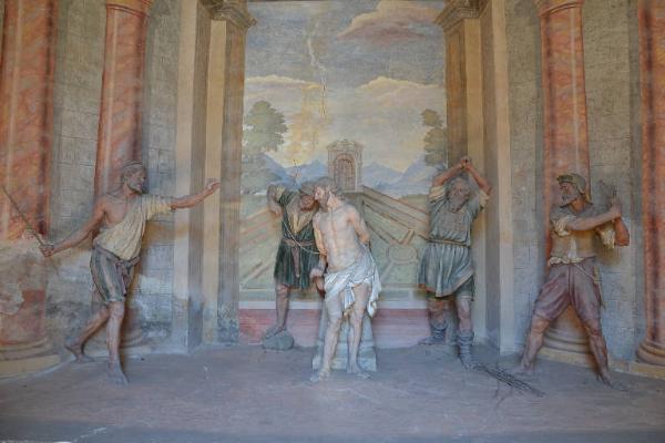 - NOTIZIE STORICO CRITICHE La settima cappella, dedicata al secondo mistero doloroso del Rosario, contiene al suo interno la scena della Flagellazione plasticamente risolta da Agostino Silva e la sua bottega. Il pellegrino che percorre il viale si trova di fronte l'elegante edificio a pianta ottagonale introdotto da un pronao, oltre al quale si staglia la facciata caratterizzata da un'ampia finestra rettangolare. Questa fu eretta per volontà di Tommaso Gilardone di Volesio e dei suoi nipoti, i quali ottennero il permesso di inserire nella facciata lo stemma della propria casata nobiliare. Allo stato degli studi attuali non è stato ancora possibile determinare con esattezza la data di inizio e conclusione delle opere murarie e neppure quelle inerenti l'affidamento dell'incarico di realizzare le statue da collocarvi. Tuttavia è probabile che l'erezione della settima cappella avvenne nel terzo quarto del XVII secolo. Tommaso Gilardone di Volesio, infatti, morì nel 1687. La famiglia nobile che governava i territori posti vicino a Tremezzo intervenne nella costruzione del Sacro Monte grazie all'intervento di fra Timoteo Snider, considerato tra i maggiori fautori della costruzione del Sacro Monte del quale fu anche custode. Figura che necessita ancora di alcuni approfondimenti storiografici, fra Timoteo è stato recentemente rivalutato dalla letteratura scientifica che, talvolta, lo indicherebbe come esperto di architettura che potrebbe anche essere intervenuto nella progettazione di questa cappella e di atre strutture del Sacro Monte.\nDopo anni di difficoltà in questi ultimi due decenni, anche per questa cappella, ha avuto inizio un progetto di valorizzazione culturale del Sacro Monte, di cui l'inserimento nel Patrimonio Mondiale dell'Umanità dell'UNESCO, avvenuto nel 2003, costituisce tappa fondamentale. All'interno dell'Accordo Quadro di Sviluppo Territoriale "Magistri Comacini", sottoscritto da Provincia di Como (soggetto capofila), Regione Lombardia, Fondazione Cariplo e numerosi altri partner che operano sul territorio, è stato redatto uno studio sul piano di gestione del complesso del Sacro Monte e alla definizione degli interventi prioritari. Tra questi sono segnalati quelli necessari al pieno recupero e restauro della quattordicesima cappella, sulla quale si spera di poter operare nei prossimi anni.