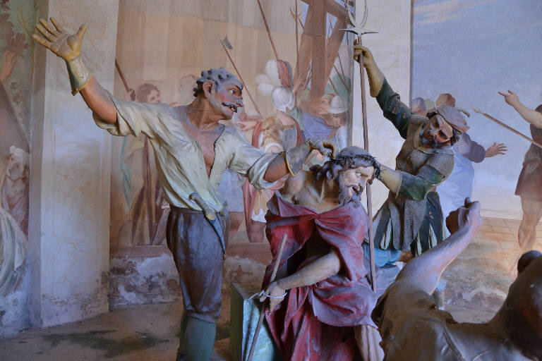 - NOTIZIE STORICO CRITICHE L'ottava cappella raffigura il terzo mistero doloroso del Rosario, contiene al suo interno la scena dell'Incoronazione di spine. La struttura architettonica, dalle semplice e contenute forme, appare al visitatore che percorre il viale di salita verso il Santuario sul lato destro. Secondo le fonti storiche la cappella fu commissionata, come la settima, dalla famiglia Gilardone di Volesio nel 1666. Tale data fu inserite anche all'interno dell'edificio dove si unisce alla firma di Agostino Silva quale autore del modellato delle statue in terracotta. Tale scritta, non è visibile dal visitatore, che potrebbe vederla se gli fosse concesso di entrare all'interno della cappella e volgesse lo sguardo nell'angolo della parete sinistra. Rispetto alle altre cappelle, il complesso delle sei statue modellate per questo piccolo edificio, risente maggiormente degli influssi della Riforma Cattolica post-tridentina e risponde con più vigore al desiderio dei committenti di accentuare il patos di commozione connesso alla scena evangelica e alla passione. Non è dunque un caso che l'artista ticinese abbia raffigurato in maniera differente i due torturatori posti ai fianchi del condannato. Il primo è vestito come un contadino del luogo, mentre il secondo come un soldato lanzichenecco. Così come in altri complessi statuari del Sacro Monte, anche in questa cappella si avverte il disinteresse dell'artista a ricercare una veridicità storica a vantaggio di una maggiore e semplificata comunicazione popolare. Qui non solo si assiste alla rinnovata reiterazione del dualismo bellezza-bene e bruttezza.-male, che riapparve con veemenza dopo le manifestazioni della cultura pestante diffusasi nella Lombardia borromaica dei primi decenni del Seicento, ma Agostino Silva insiste su una comunicazione scenografica molto caricata, quasi prossima al grottesco, che trova in parte collegamenti con la cultura del teatro popolare sacro e profano. All'interno della cappella fu chiamato ad operare anche Carlo Gaffuri, che dipinse le sue opere concludendole nel 1667. Indipendentemente dalle analisi storiografiche e iconologiche possibili, si è certi che il connubio ra scultura, architettura e pittura riscosse un buon giudizio e che Gaffuri fu particolarmente contento del lavoro svolto e del suo rapporto con Timoteo Snider, considerato tra i maggiori fautori della costruzione del Sacro Monte del quale fu anche custode. Numerosi documenti datati 1667, infatti, attestano questo sodalizio e i conseguenti regolari pagamenti.\nDopo un periodo difficile per la conservazione del patrimonio artistico conservato in questa, avvenuto nel XIX secolo, una prima campagna di restauri si concluse nel 1935. Altre ne sono poi seguite anche in epoca recente. Infatti dopo anni di difficoltà, anche per questa cappella, ha avuto inizio un progetto di valorizzazione culturale del Sacro Monte, di cui l'inserimento nel Patrimonio Mondiale dell'Umanità dell'UNESCO, avvenuto nel 2003, costituisce tappa fondamentale. All'interno dell'Accordo Quadro di Sviluppo Territoriale "Magistri Comacini", sottoscritto da Provincia di Como (soggetto capofila), Regione Lombardia, Fondazione Cariplo e numerosi altri partner che operano sul territorio, è stato redatto uno studio sul piano di gestione del complesso del Sacro Monte e alla definizione degli interventi prioritari. Tra questi sono segnalati quelli necessari al pieno recupero e restauro della quattordicesima cappella, sulla quale si spera di poter operare nei prossimi anni.