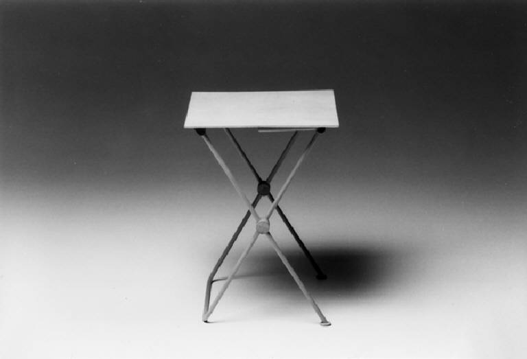Modello di studio per tavolo pieghevole composta da un cavalletto, realizzato con tubi a sezione circolare raccordati per sovrapposizione con cerniere, il quale sostiene il piano d'appoggio quadrato.