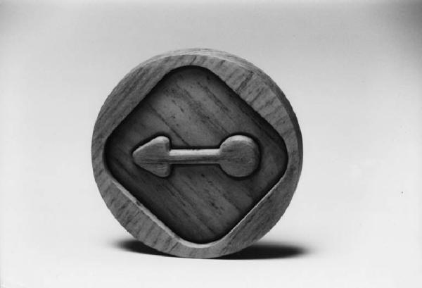 Modello di studio per giocattolo per bambini neonati composto da tre parti concentriche ad incastro: una freccia stilizzata, un rombo ed un cerchio (vedi anche scheda 115).