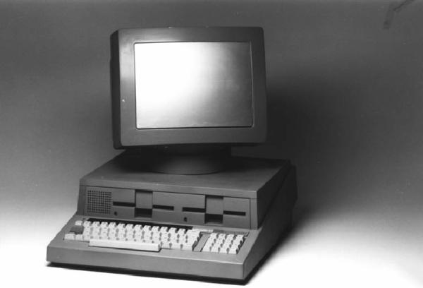 Modello di studio per computer da tavolo costituito da due parti ben distinte: una base prismatica contenente la tastiera, due lettori floppy-disk, l'altoparlante e i vari componenti; un monitor a tubo catodico.