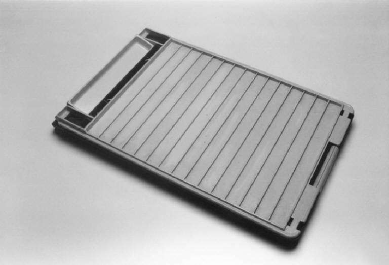 Modello di studio per portablocco composta da tavoletta rettangolare con nervature e, in corrispondenza di un bordo, piccola vaschetta contenitore rettangolare.