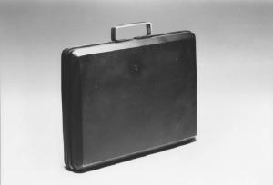 Modello di studio per valigetta ventiquattrore realizzata con un solido prismatico a sezione rettangolare con gli angoli smussati a 60° e maniglia centrale. Il modello è di colore nero.
