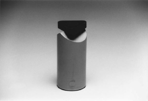 Modello di studio per bottiglia di disinfettante. E' realizzato con un cilindro sezionato, nella parte sommitale, secondo due piani inclinati di 45°. E' dotato di un tappo a pianta circolare. Il modello è di colore turchese e verde scuro.
