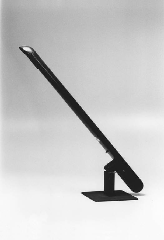 Modello di studio per lampada da tavolo composta da una base a pianta quadrata con supporto centrale snodato e corpo lampada costituito da una spessa asta rettilinea dai bordi arrotondati.