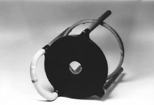 Modello di studio per sgabello da bar caratterizzato da lunghe gambe irrigidite da un anello che funge da poggiapiedi; piano di seduta con foro centrale; basso schienale che funge anche da maniglione per lo spostamento dello sgabello.