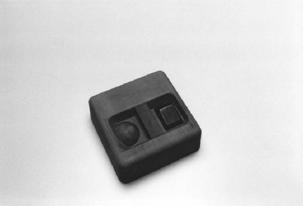 Modello di studio per interruttore elettrico costituito da un solido prismatico a pianta quadrata e sezione rettangolare. Nel bordo superiore sono stati ricavati due incavi per alloggiare l'interruttore e la spia luminosa.