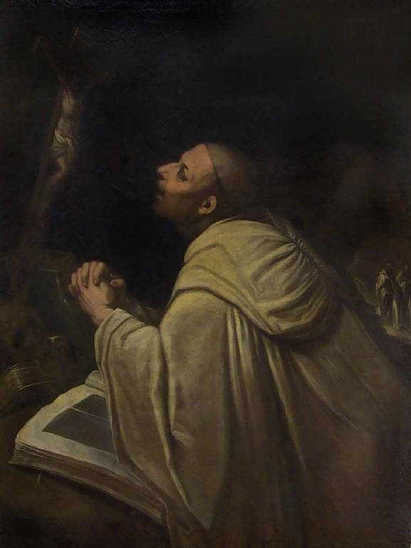 - NOTIZIE STORICO CRITICHE Il dipinto pervenne alla Pinacoteca Repossi grazie al lascito di Antonio Rota risalente ad una data non precisata. Infatti presso la Biblioteca Morcelli (Fondo Ginnasio, b. 1 Inventari) si conserva un biglietto da visita di Giovanni Battista Rota al verso del quale si trova una nota manoscritta di Antonio Rota con la quale egli esprime la volontà di donare alla pinacoteca clarense i seguenti tre quadri: "S. Anna del Salmeggia; S. Lucia del Paglia; B. Bernardo de' Tolomei di Daniele Crespi". Nella medesima nota Antonio Rota indica anche che, in caso di vendita, l'importo di tale operazione dovesse essere devoluto alla Congregazione di Carità. Al momento della donazione pertanto quest'opera era attribuita a Daniele Crespi; pur non accettando tale attribuzione, anche Terraroli confermava l'ambito di provenienza e il limite cornologico, facendo discendere i forti tagli di luce e l'atteggiamento fortemente retorico della figura del santo dal magistero di Giovan Battista Crespi detto il Cerano e dalla maniera fortemente luministica e patetica di Francesco Cairo. In questa sede non paiono però accettabili le conclusioni dello studioso preferendo collocare il dipinto in un ambito temporale e spaziale assai diverso. Forti tangenze stilistiche, oltre che tipologiche portano ad attribuire l'opera al bresciano Francesco Savanni che nel 1760 dipingeva una grande tela per la soppressa chiesa bresciana di Santa Francesca Romana (oggi in collezione privata bresciana) raffigurante san Benedetto che comanda a san Placido di estrarre san Mauro dalle acque che per le stesse accensioni cromatiche, i tagli di luce e la liquida materia pittorica che disegna i fantasmatici personaggi in saio bianco, mostra tangenze fortissime con l'opera clarense, allo stesso modo giocata sul grande contrasto tra la figura del beato Tolomei, quasi ridotto a una esuberante massa di panni bianchi, e il resto della composizione immerso in una umbratile atmosfera notturna dove i baluginii delle luci fattesi filamentose si intaglientiscono sugli oggetti alla stessa maniera di quanto sperimentato dall'artista nella tela bresciana e in altre opere compiute durante la sua non sempre fortunata carriera.