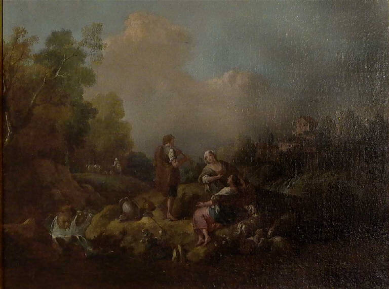 - NOTIZIE STORICO CRITICHE Come il suo pendant (inv. n. D00028), questo Concerto campestre è stato riconosciuto da Maggi (2003-2004, p. 102) in uno dei due "Paesaggi con pastorizie con cornice dorata" presenti nella Distinta delle opere lasciate da Pietro Bartolomeo Repossi nel 1854. L'attribuzione allo Zuccarelli, tradizionale fin dall'inizio del Novecento, non è condivisa solo da Terraroli (1991, p. 38) che preferisce fare il nome di Giuseppe Zais. Tale attribuzione non pare, comunque, pertinente, preferendo qui mantenere la tradizionale ascrizione al pittore di Pitigliano per gli evidenti caratteri di matrice classicista che si riscontrano sia nella impaginazione del paesaggio che nella impostazione delle figure, rette da una ferrea ed elegante costruzione disegnativa.