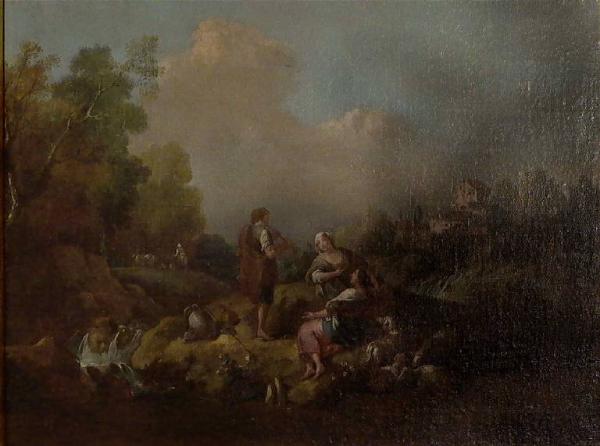 Al centro, su un'altura, due pastorelle si rilassano al suono dello strumento a fiato suonato da un pastore; accanto a loro, a destra, alcuni animali riposano; in profondità a sinistra si vede un'altra pastorella che conduce alcuni animali al pascolo; a sinistra si vedono alcune costruzioni, compreso un ponte che attraversa una cascata.