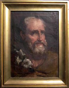 - NOTIZIE STORICO CRITICHE Il dipinto a causa del non buono stato di conservazione è di difficile lettura e anche l'attribuzione, genericamente indicata in un pittore bresciano della fine del Settecento da Terraroli, trova qualche difficoltà ad essere meglio precisata. Entrato nella Pinacoteca grazie al lascito di Pietro Bartolomeo Repossi come una semplice "testa di S. Giuseppe con cornice dorata" (Maggi, 2003-2004, p. 110), fu successivamente attribuita da Luigi Repossi (1855, p. 14) al Moretto, attribuzione che, seppure non sposata, fu causa di fraintendimenti che portarono a riconoscere erroneamente nel dipinto di Giuseppe Vermiglio raffigurante San Giacomo maggiore, l'opera lasciata dal Repossi. Tale fraintendimento è stato solo recentemente sanato (G. Fusari, Alessio Antonio Rota: tracce per una doverosa riscoperta, in La Cultura della Memoria. Uomini libri e carte della Biblioteca Morcelliana, Quaderni della Fondazione Biblioteca Morcelli Pinacoteca Repossi, n. 3, Roccafranca (Bs) 2002, p. 53) grazie al ritrovamento di un breve elenco delle opere in possesso di Alessio Antonio Rota tra le quali figurava appunto il dipinto del Vermiglio con l'altisonante attribuzione a Caravaggio. I caratteri stilistici, comunque, lasciano pensare a un artista attivo nel bresciano nella seconda metà del Settecento, non distante dalla maniera di Antonio Dusi, ma da lui discosto per la pennellata più franta e sfrangiata e per il colore meno compatto e fragrante. In via del tutto ipotetica è possibile avvicinare questo dipinto della Pinacoteca Repossi alle opere del poco conosciuto Stefano Geroldi che firma due tele raffiguranti il Battesimo di Cristo e San Giorgio e il drago nel Santuario della Madonna della Misericordia di Bovegno, uniche opere conosciute del pittore dopo il trafugamento di altre due tele, datate 1774, dalla parrocchiale di San Lorenzo a Magno di Bovegno. Come nella tela clarense, in questi dipinti triumplini, si nota il disgregarsi della forma a tutto vantaggio del movimento cromatico dato dalla pennellata sugosa e vibrante, così come si nota, soprattutto nella tela del Battesimo di Cristo, un trattamento assai simile delle fisionomie che riprende, seppure nel generale sfaldamento della compattezza disegnativa, il carattere di transizione di molte delle opere del longevo salodiano Sante Cattaneo.