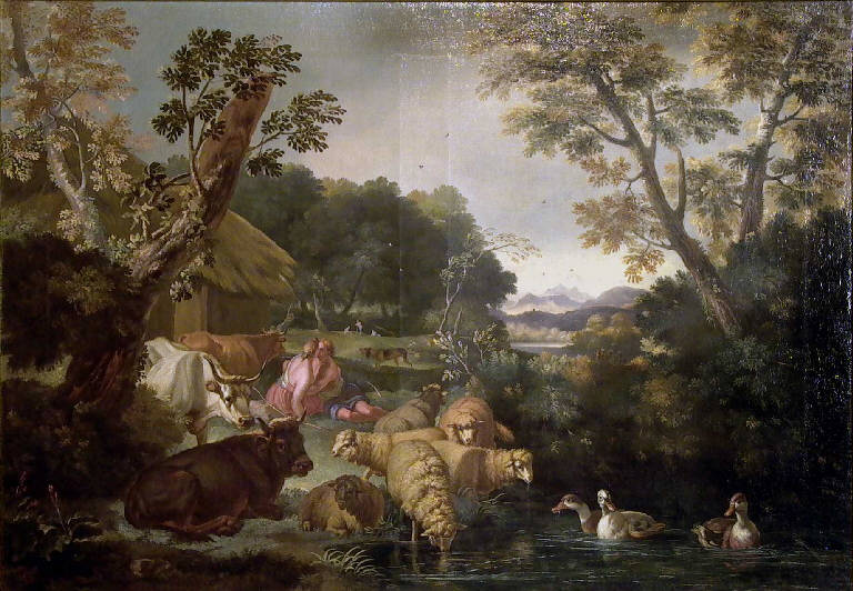 - NOTIZIE STORICO CRITICHE Il dipinto, insieme al suo pendant (inv. n. D00034) fa parte del lascito di Pietro Bartolomeo Repossi. I due dipinti, infatti, sono riconoscibili come i due Paesaggi senza cornice della Distinta delle opere lasciate dall'avvocato nel 1854 ed erano esposti in Pinacoteca come sopraporta fino al 1929. L'attribuzione a Pietro Pinnari (o Bianchi) è stata pubblicata da Terraroli (1991, p. 39) sulla base del reperimento della firma su entrambe le opere; tuttavia, come sottolinea lo studioso, non ci sono notizie che possano concorrere a identificare il pittore a meno che lo si identifichi con Pietro Bianchi detto il Creatura, artista romano (1694-1740) "allievo di Baciccia e Luti, ma del quale non si conoscono altre Scene pastorali", mentre la generica attribuzione al Bianchi milanese, ossia a Isidoro Bianchi, dell'Inventario del 1973 pare del tutto insostenibile per motivi cronologici e stilistici. Nella tela raffigurante Angelica e Medoro, l'episodio tratto dall'Orlando Furioso dell'Ariosto è trasformato in una piacevole veduta campagnola nella quale i due personaggi, immersi nelle verdi arborescenze di un ampio pascolo, cedono il passo al bestiame posto in primo piano che mostra taluni caratteri avvicinabili alla pittura del Londonio e riapre la possibilità di cercare altrove, probabilmente in ambito milanese, l'autore di queste due gustose scene bucoliche.
