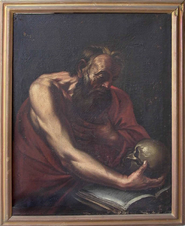- NOTIZIE STORICO CRITICHE Il non buono stato di conservazione del dipinto, interessato da diverse ridipinture, forse ottocentesche, non permette una soddisfacente lettura del dipinto che rivela, comunque, la sua origine lombarda nella costruzione monumentale della figura e nell'insistenza sui particolari realistici, specie nel viso solcato di rughe, oltre che nella gestione della luce dalla quale il braccio nudo del santo emerge con prepotente tridimensionalità. La potenza plastica della figura che emerge dall'ombra connotandosi attraverso particolari minuti, resi con una pennellata robusta e sugosa, a tratti compendiaria, mostra un artista legato alla cultura figurativa milanese, a metà tra l'arte di Giulio Cesare Procaccini e quella di Giuseppe Nuvolone detto Panfilo, in un contesto che, seppur destinato alla fruizione devozionale, non scade in troppo facili patetismi, assestandosi su un risultato comunque di discreto livello qualitativo sia nella concezione dell'insieme che nella concertazione dei particolari della figura.