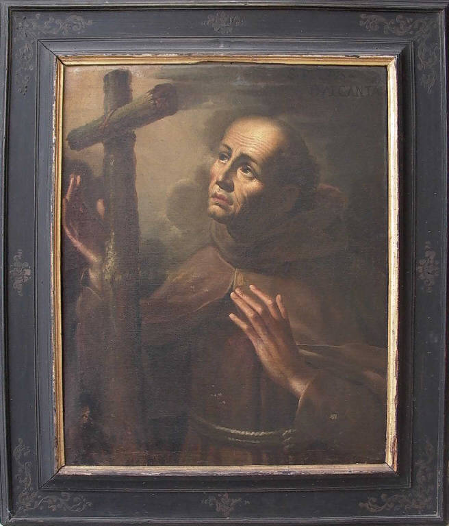 - NOTIZIE STORICO CRITICHE Il dipinto di chiara intonazione devozionale, proviene quasi certamente dal convento clarense di San Bernardino e nell'Inventario del 1918 è detto di proprietà della Fabbriceria di Santa Maria. Raffigura il santo, secondo la consueta iconografia, abbigliato da francescano, in adorazione di una ruvida croce di legno. Stilisticamente il dipinto è assegnabile all'ambito lombardo, probabilmente milanese, per i forti caratteri realistici della figura e l'importanza data ai contrasti luministici e chiaroscurali. La pennellata libera e ricca di materia e il trattamento della figura con un buon approfondimento psicologico del personaggio segnala un artista che, seppur anonimo, si dimostra capace di una pittura corretta e aggiornata sulle novità di secondo Seicento, specialmente nell'ambito di Ercole Procaccini il giovane e della vasta bottega dei Nuvolone.