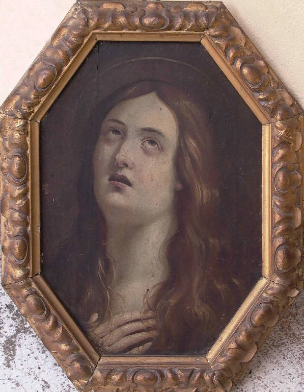 - NOTIZIE STORICO CRITICHE Il dipinto è ritenuto da Terraroli pendant del San Michele arcangelo conservato nella stessa Pinacoteca Repossi (inv. n. D00045) per "le medesime misure, la stessa cornice, il medesimo taglio devozionale e identiche soluzioni pittoriche", caratteri questi però troppo genericamente applicati alle due tavole alle quali, per identica forma e misure dovrebbe essere accostata anche una bella Crocifissione con la Maddalena (inv. n. D00078).\nUn'analisi più attenta rivela, d'altro canto, che le tre tavolette ottagone appartengono sì ad una produzione abbastanza popolare ma rivelano caratteri stilistici tutt'altro che omogenei. In più questa raffigurante la Maddalena, con il taglio ravvicinato della figura, ridotta praticamente al solo volto, poco ha a che vedere con l'impostazione delle altre due. Il dipinto in esame, infatti, pare piuttosto un frammento di una composizione più ampia ridotta alle attuali dimensioni per fare da pendant alle altre due tavolette. Stilisticamente, inoltre, la si può collocare in ambito emiliano (e non bresciano come ipotizzato da Terraroli), per l'intonazione classicista dell'insieme e la conduzione pittorica levigata e accademica dell'incarnato della santa e delle lumeggiature che ravvivano i lunghi capelli, caratteri tutti che discendono dal largo seguito avuto, specialmente in ambito emiliano, dalla pittura di Guido Reni.